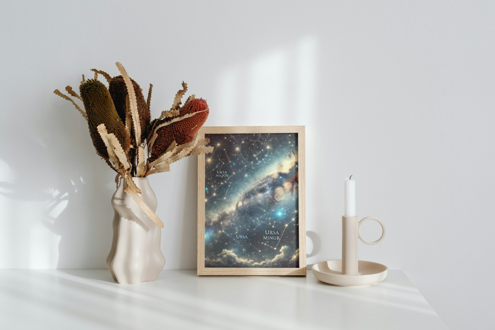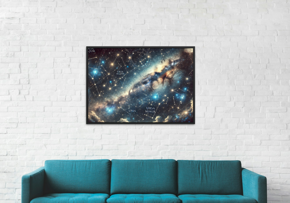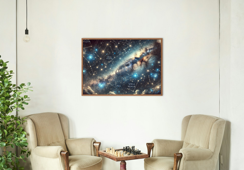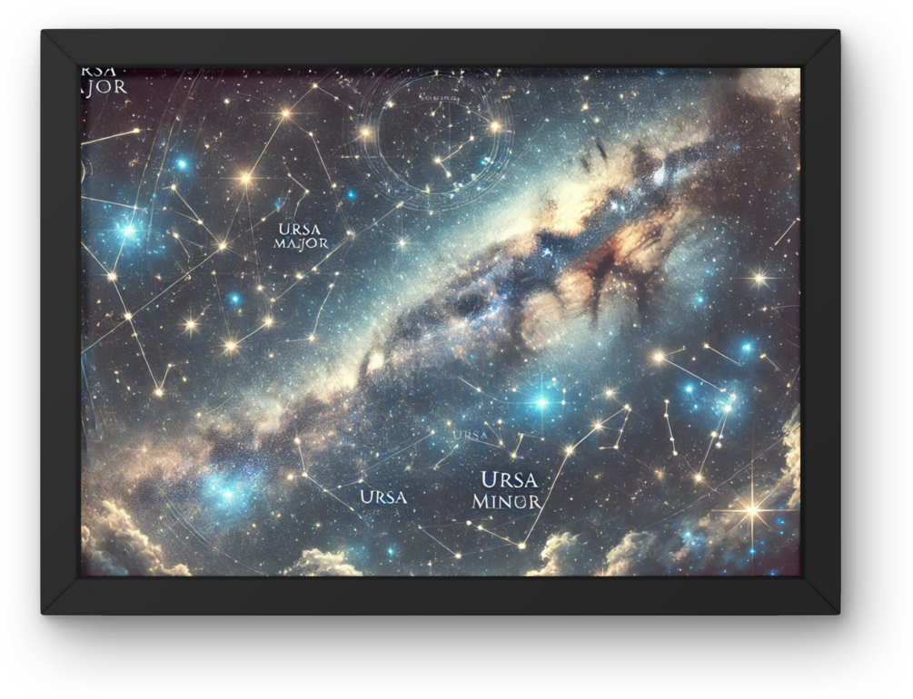 A captivating illustration of the constellations Ursa Major (The Great Bear) and Ursa Minor (The Little Bear), two iconic star formations in the northern hemisphere. Known for their rich mythology and astronomical significance, these constellations include famous stars such as Dubhe and Merak in Ursa Major, and Polaris, the North Star, in Ursa Minor. Together, they create a celestial map that has guided explorers and stargazers for millennia.